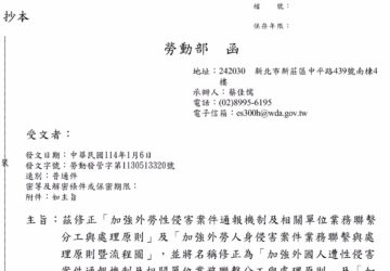 勞動部函 修正「加強外國人遭性侵害案件通報機制及相關單位業務聯繫分工與處理原則」及「加強外國人人身侵害案件業務聯繫與處理原則及流程圖」
